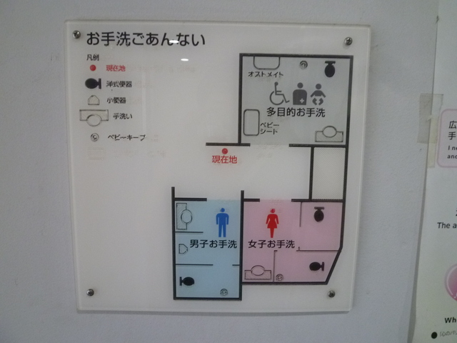 トイレは改札口を入って右側にあります。 ■多機能トイレは男女共用1室のみの設置です。 ■ドアは手動です。 ■オストメイト対応汚物流し(給湯設備付き)があります。 ■ベビーシート・ベビーチェアがあります。 ■一般トイレにベビーチェアがあります。 ■一般トイレにはウォシュレットの設置はありません。 |