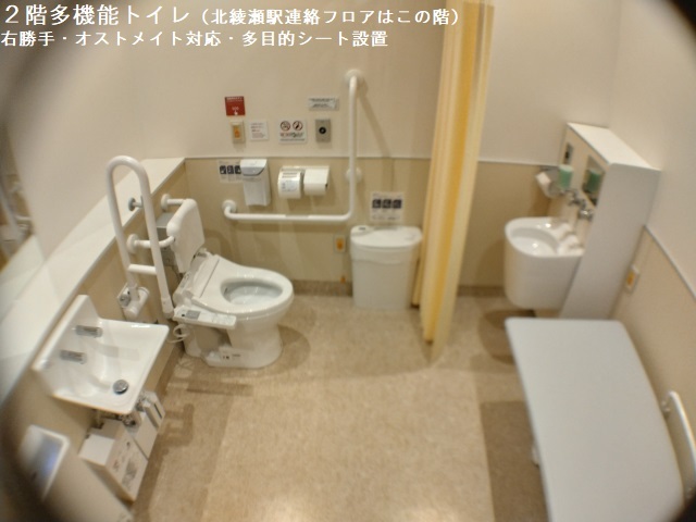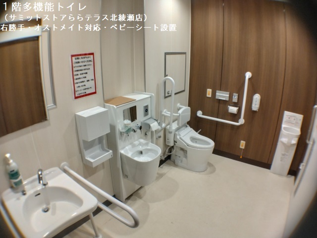 トイレ・多機能トイレは1階・2階・4階にあります。 1階トイレは多機能トイレのみサミットストアららテラス北綾瀬店に内包されています。 トイレ利用可能時間は1階のサミットストアららテラス北綾瀬店営業時間を記載しています。物販・サービス店舗は10:00~21:00、飲食店は11:00~22:00の営業です。 東京メトロ千代田線 北綾瀬駅北改札口を出た先の連絡通路で2階に直結しています。 ●全て男女共用1室のみの設置 ●ドアは全て手動 ●全てオストメイト対応汚物流し(給湯設備付き)設置 ●2階・4階に多目的シート設置 ●1階にベビーシート設置 ●全てベビーチェア設置 ●一般トイレ内にベビーチェア設置 ●2階・4階一般トイレ内に簡易多機能個室設置(ドアは手動、個室内に着替え台設置) ●2階・4階に子供用トイレ設置 ●4階に授乳室設置 【参考URL】 https://mitsui-shopping-park.com/lalat-kitaayase/ |