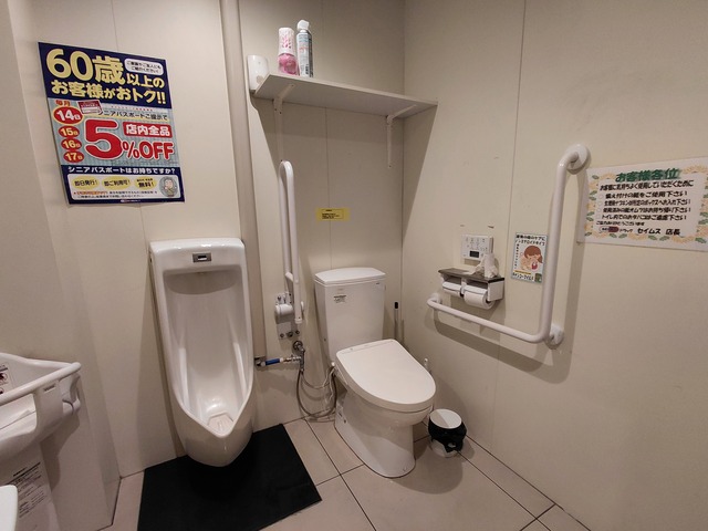 店内入って右奥にあります。 洗面器に手すりはありません。水栓は自動水栓です。 便器は車椅子用の高さのものです。 便座は蓋つきです。 小便器もありますが小便器には手すりはありません。 乳幼児設備はベビーチェアのみです。 |