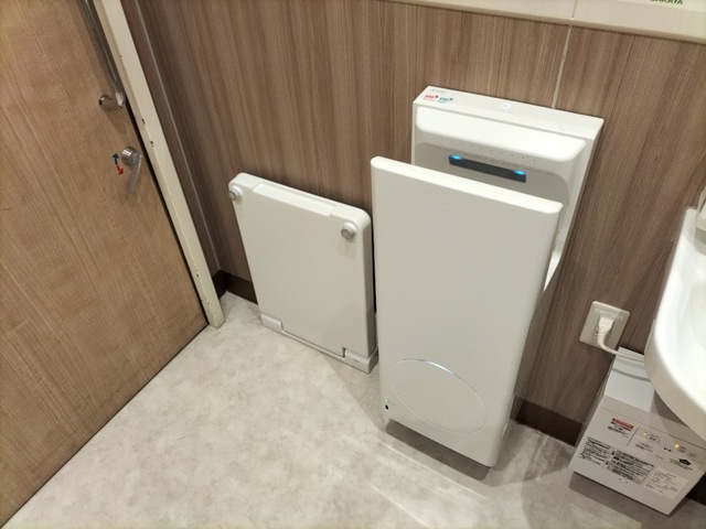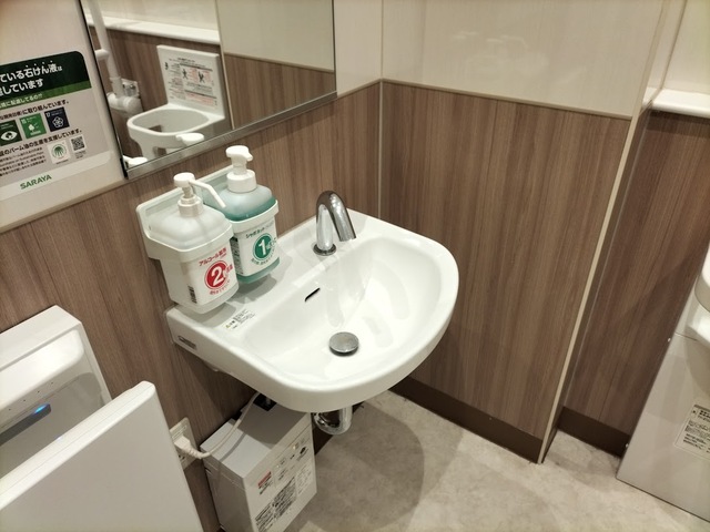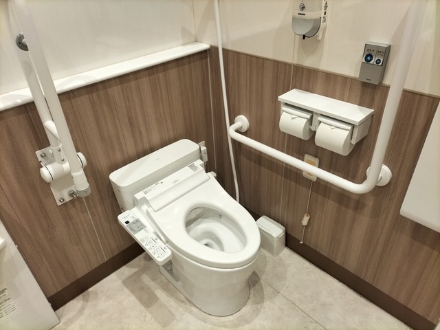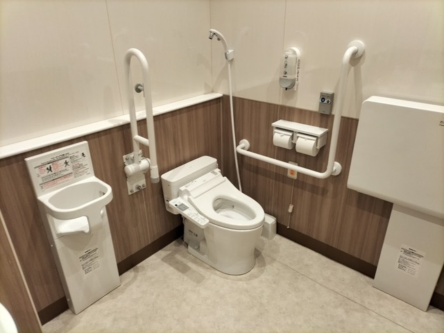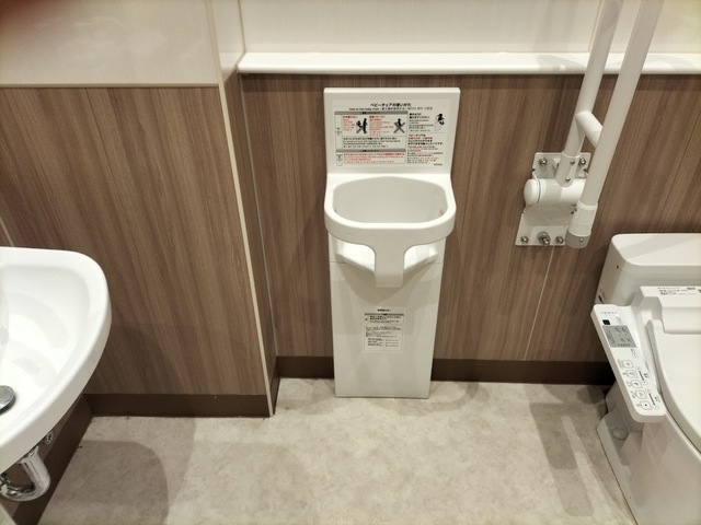 トイレは、1階風除室と、2階エレベーター付近にあります。 1階のトイレは男女兼用多機能トイレのみ、2階のトイレは男女別トイレと、多機能トイレの設置です。 1階のトイレは、狭く、オストメイト非対応です。 2階のトイレは、それなりの規模感であるものの、オストメイトは便器に付いているシャワー水栓です。 トイレの設備は、(両階共通)手洗い器、ベビーシート、ベビーチェア、洋式便器(2階のみ)着替え台、オストメイト対応シャワー水栓です。 2階一般トイレ内にも、ベビーシートの設置がございますので、そちらを優先的にご利用ください。 |