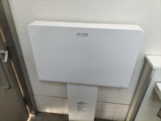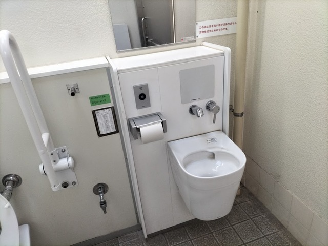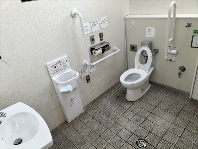 トイレは、男女兼用多機能トイレのみの設置です。 設備は、手洗い器、ベビーシート、ベビーチェア、オストメイト対応汚物流し、高座面の洋式便器です。 |