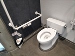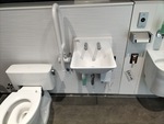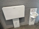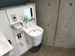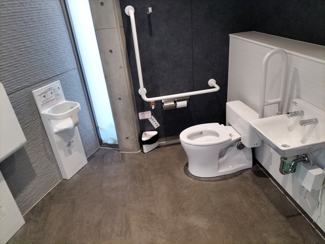 多機能トイレは、男女兼用1室のみの設置です。 トイレ内の設備は、手洗い器、ベビーシート、ベビーチェア、オストメイト対応汚物流し、洋式便器です。 洋式便器は、リモコン便器洗浄非対応で、タンク横レバーを操作しないといけません。 温水洗浄便座の設置はありませんが、石鹸の備え付けがあります。 扉は特殊なタイプで、非常に重く、健常者である私でも重いと感じるレベルです。 しかも、取っ手が特殊でつかみづらいです。 |