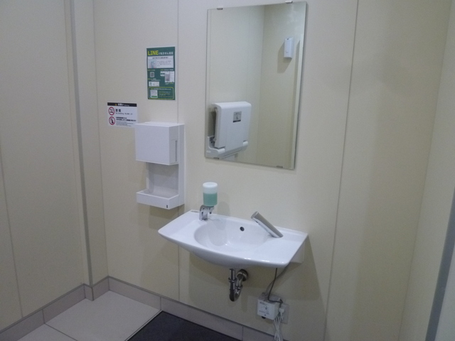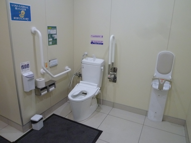 トイレは風除室内にあります。 ■多機能トイレは男女共用1室のみの設置です(男性用トイレと兼用です)。 ■ドアは手動です。 ■オストメイト用洗浄ハンドシャワーがあります。 ■オストメイト対応便座(前広便座「ZA FREE」)があります。 ■ベビーシート・ベビーチェアがあります。 ■便器洗浄はタンク右側面のレバーのみです。 |