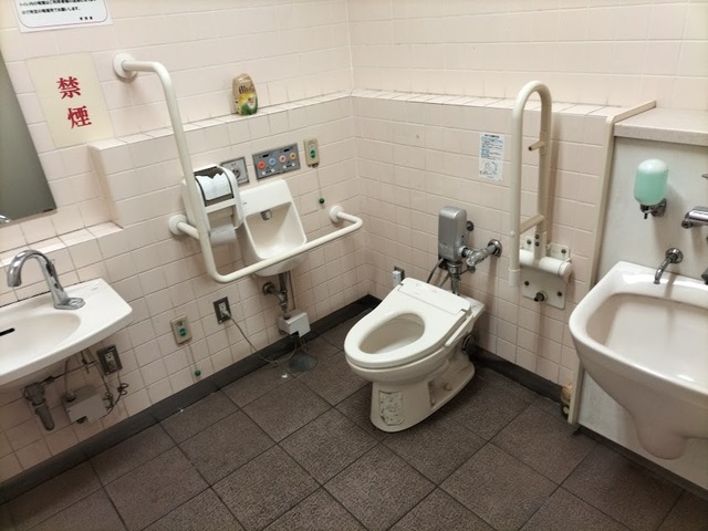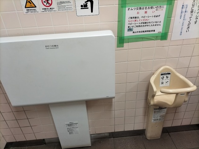 トイレは、駐輪場外にあり、誰でもご利用になれます。 トイレは、男女別トイレと、多機能トイレの設置です。 トイレ内の設備は、手洗い器、ベビーシート、ベビーチェア、オストメイト対応汚物流し、洋式便器です。 洋式便器には、温水洗浄便座の設置があります。 |