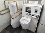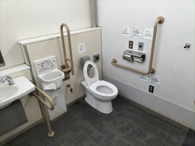 トイレは、女性用多機能トイレと、男女兼用多機能トイレの設置です。 女性用多機能トイレと、男女兼用多機能トイレは、基本的に同仕様ですが、男女兼用多機能トイレには小便器があります。 男女兼用多機能トイレ内の設備は、手洗い器、小便器、ベビーシート、ベビーチェア、オストメイト対応汚物流し、洋式便器です。 |